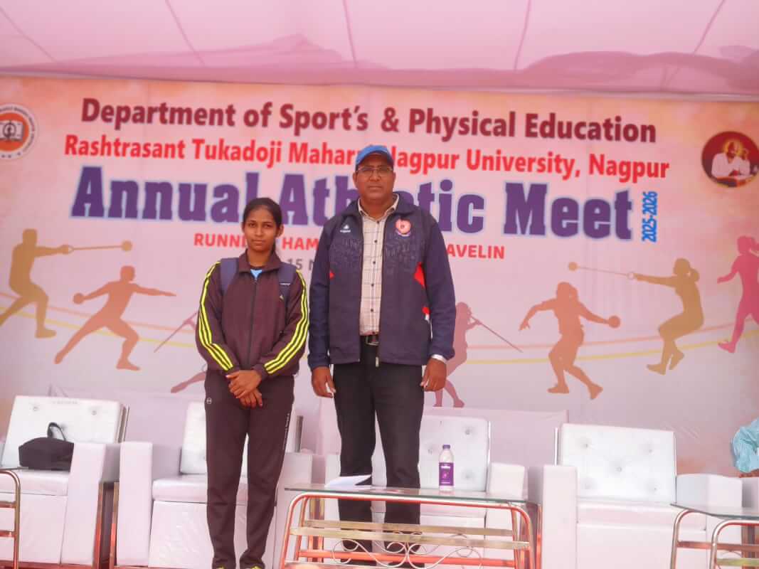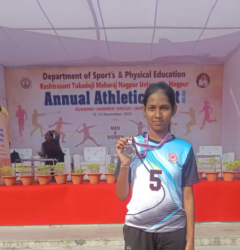 नागपूर विद्यापीठ शारीरिक शिक्षण विभागातर्फे घेण्यात आलेल्या आंतर महाविद्यालयीन Athletics स्पर्धेत Shot-put या क्रीडा प्रकारात आपल्या महाविद्यालयातील B.Sc. प्रथम वर्षाची खेळाडू कु. तृप्ती मानवटकर हिने Silver medal भूषविले. त्या बद्दल, धरमपेठ शिक्षण संस्थेचे अध्यक्ष ऍड. श्री. उल्लासजी औरगाबादकर, उपाध्यक्ष श्री. दिपकजी दुधाने, सचिव श्री. सुरेशजी देव, डॉ. विलासजी देशपांडे, महाविद्यालयाचे प्राचार्य डॉ. पेशवे सर, उपप्राचार्य डॉ. आंबेकर सर, प्रा. गायकवाड सर, उपप्राचार्य प्रा.काशीकर मॅडम, पर्यवेशिका प्रा. भोयर मॅडम, प्रा. अतुलजी मोघे, क्रीडा आणि शारीरिक शिक्षा विभाग प्रमुख आणि प्रशिक्षक डॉ. राहुल कलोडे यांनी अभिनंदन केले.